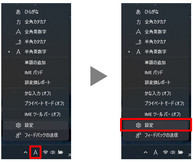 (デフォルトでは)画面右下にあるアルファベットの「A」やひらがなで「あ」と表示されているMicrosoftIMEを右クリックして、表示されたIMEオプションから「設定」をクリックして開きます。これで設定が開けた場合、旧バージョンの手順はスキップできます。