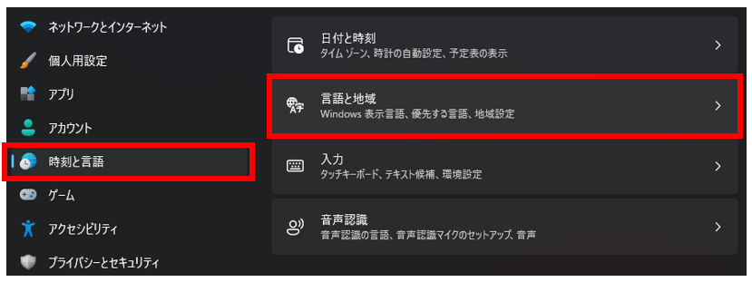設定のメニューから「時刻と言語」を選択し、「時刻と言語」のメニューから「言語と地域」を開く
