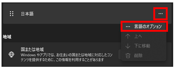 「言語と地域」のメニューから日本語の右にある「・・・」を選択し「言語のオプション」を開く