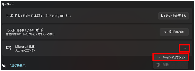 「言語のオプション」メニューのキーボードメニューのMicrosoft IMEの右にある「・・・」を選択し「キーボードオプションを開く