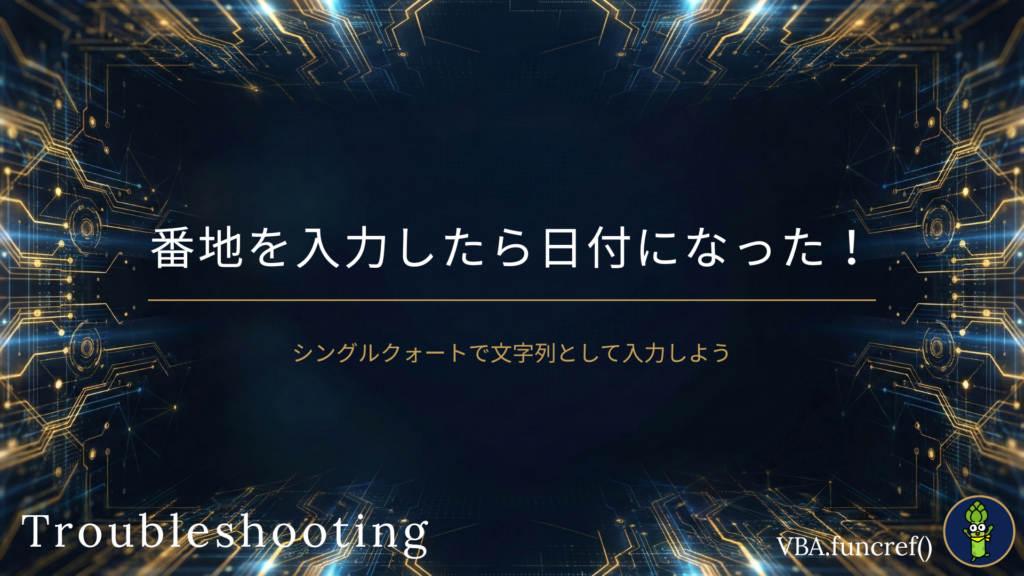 PCトラブル即解決 【Excel】番地を入力すると日付になる|「1-2-3」が「2001/2/3」に変わる時の対処法 Excelで住所の番地「1-2-3」を入力すると「2001/2/3」に変換される原因と対処法。先頭にシングルクォート「'」を付けるだけで解決します。入力方法を図解で説明。 2026.01.27 LogicPCトラブル即解決